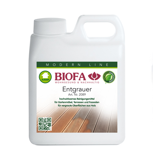 BIOFA-Entgrauer 2089 ist ein intensiver Reiniger für unbehandeltes und behandeltes vergrautes Holz. Er reinigt, frischt und hellt vergraute Terrassen Dielen, Gartenmöble, Holz Fassaden, etc. im Außenbereich wieder auf und gibt dem Holz sein urspüngliches Aussehen zurück.